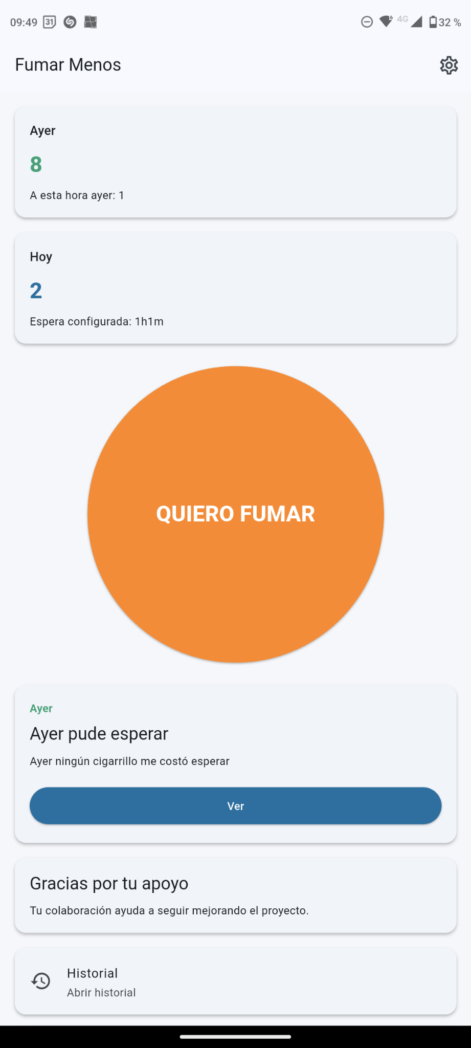 Si decides fumar, la app lo registra y te muestra si ya cumpliste o no el tiempo configurado.